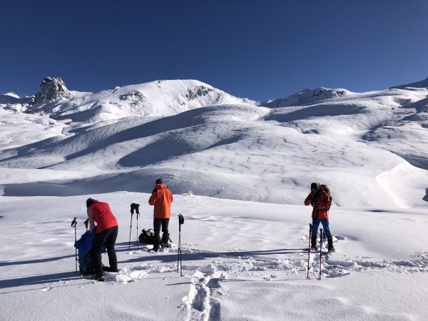 Nous commençons cette journée en visant le col l’Eychassier situé à 2917 m d’altitude ; c’est une bonne montée qui nous réchauffe l’esprit et les jambes. Le soleil sort et nous pouvons profiter d’une vue magnifique des deux côtés du col. Puis, nous nous dirigeons à travers de la neige vierge vers le col Agnel à 2744 m d'altitude, qui relie les Hautes-Alpes et le Piémont en Italie. Il est le deuxième plus haut col routier des Alpes françaises, juste derrière le col de l'Iseran (2764 m). A la suite, c’est le col Vieux à 2806 m. Puis nous redescendons au refuge. C’est une journée plutôt dans les hauteurs, avec des points de vigilance et la mise en place de stratégies pour bien gérer le risque d’avalanche.