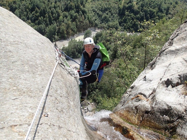 Mardi : Albert et Irène décident d’aller faire une journée découverte culturelle locale : manger une entrecôte-frites et aller au supermarché. Christine, Erik, François, Marc et moi découvrons alors le magnifique canyon de Val Bianca. Christine commence par sortir l’adhésif américain pour redonner jeunesse à ses chaussures défoncées et essayer de battre le record des précédentes chaussures d’hiver d’Albert (12 ans). Christine s’est albertisée : AR, c’est plus qu’un sigle, c’est un état d’esprit. La première partie est faite de successions de toboggans ludiques, de sauts dans des vasques limpides dans un bel encaissement. Puis, changement de thème dans la deuxième partie abrupte, ouverte sur la vallée, enchainant sans discontinuité de grandes verticales et une vasque suspendue. Sur le chemin du retour, la dernière cascade se termine sur un siphon facultatif, ludique ce jour, mais qui doit être compliqué par grand débit. On s’installe en terrasse pour le rituel quotidien d’une glace italienne. Parfum carotte, violette, curcuma et spiruline sont aussi proposés à la carte des glaces de ce petit village perché ; il faudra y revenir avec Irène, adepte du jus de pomme-bergamote bio.