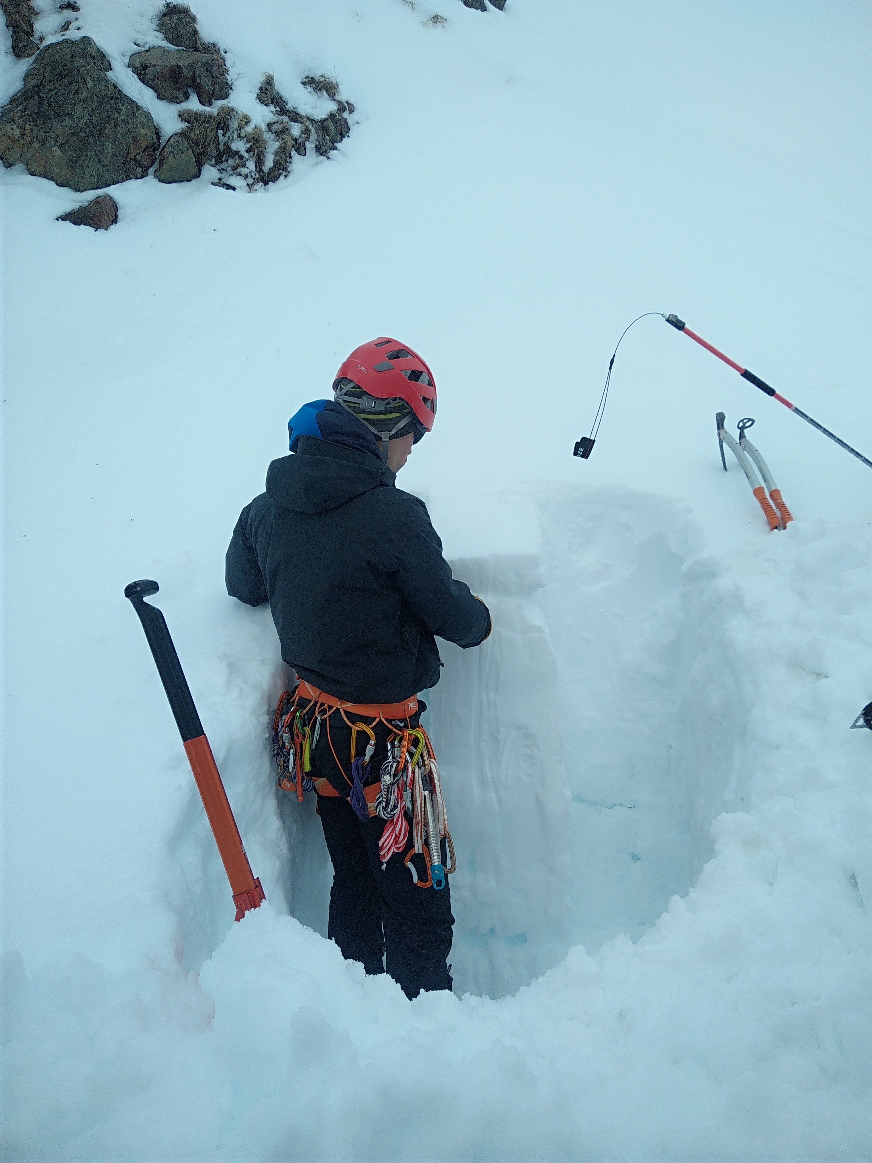Nous avons également réalisé une coupe de neige d’environ 1,50 m dans une zone d'accumulation pour observer les différentes couches superposées au cours de la saison et mieux comprendre le manteau neigeux.