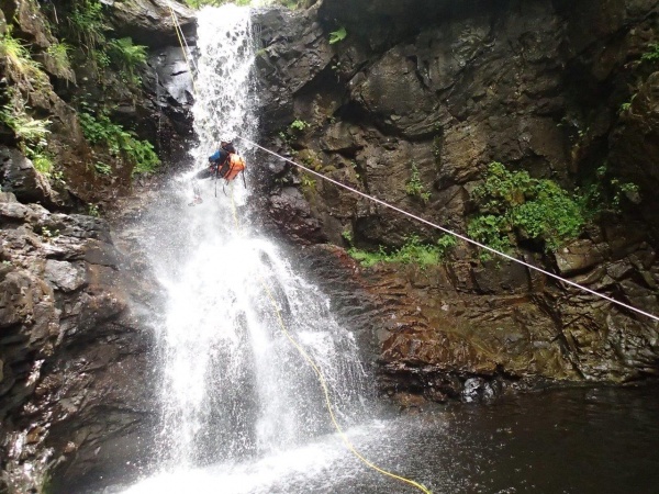 Nous poursuivons par un petit rappel de 2 m car l’eau n’est pas assez profonde pour sauter. Ensuite, nous continuons sur une dizaine de mètres dans les cailloux et une eau peu profonde, pour arriver en haut d'une superbe cascade : douze mètres de vide devant nous. Ceci nous permet, grâce à un rappel « guidé », de descendre loin de la cascade qui ainsi ne nous asperge pas (ou pas trop !). Heureusement, car en plus la température n’est pas très élevée.