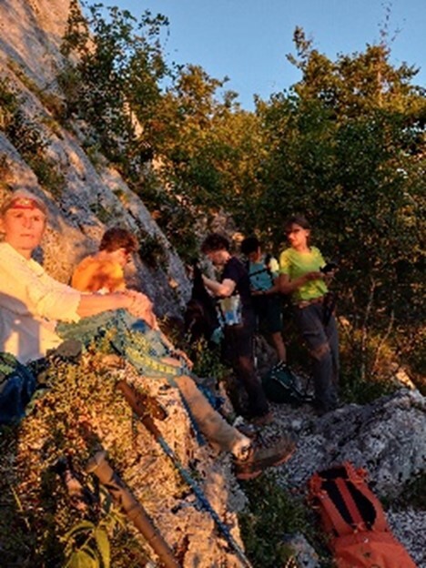 Cherché l’itinéraire pour le retour au gîte. Trouvé un sentier pour le retour direct à pied, des rafraîchissements locaux, une douche et une séance d’étirements pour parfaire la journée avant le repas préparé par nos chef et cheffe locaux.