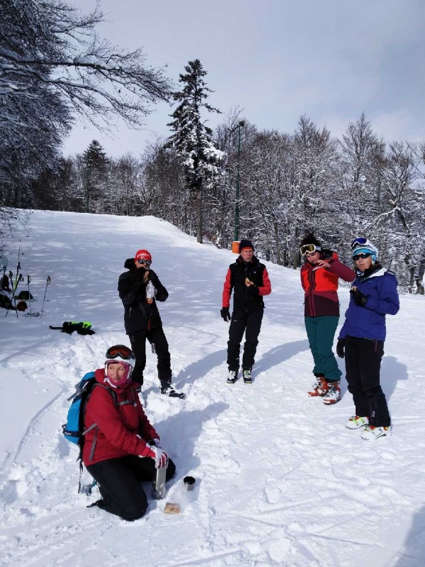 Une belle récompense nous attend pour la descente qui se déroule sur une neige de rêve et sous un ciel dégagé. Après l'effort, c'est l'heure du casse-croûte dans les bois et sous le soleil :