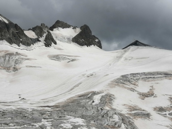 Après un pique-nique monumental pris au refuge, nous montons à 3211 m par le téléphérique (gare des Ruillans) et découvrons le glacier de la Girose très crevassé.