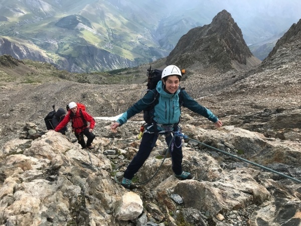 Finalement, nous effectuons quelques entrainements avec une corde prêtée par la gentille gardienne du refuge. Nous faisons deux exercices de descente en rappel et ensuite nous découvrons le glacier de la Meije depuis la brèche de Pacave.