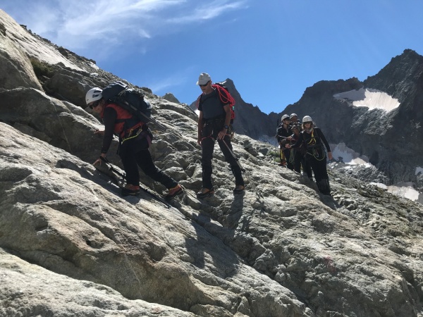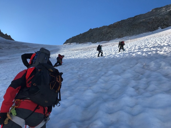 Départ de nos trois cordées et arrivée sous le col du Replat : nous expérimentons la montée en cordée, le respect des distances et les conversions. En progressant vers le col, à mi-chemin, nous croisons une cordée descendante avec guide : nous discutons, ils nous avertissent de la difficulté. A 100 m du col, la glace devient vive, le glacier plus pentu, on décide donc de faire demi-tour sans atteindre le col.