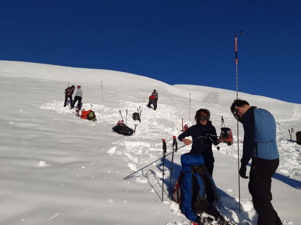 Après un bon petit déjeuner, notre deuxième journée est consacrée aux ateliers. Le matin sous un soleil radieux, nous allons apprendre à utiliser un DVA (détecteur de victimes d’avalanche), une sonde et une pelle, toujours répartis en petits groupes.