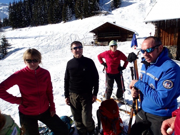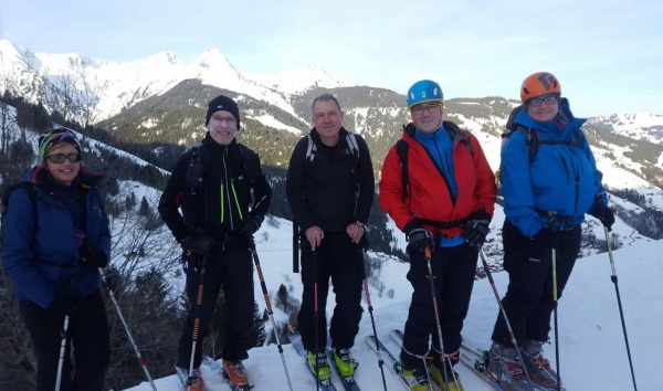La fine équipe des sept Clermontois réunissait des skieurs de niveaux différents (de tout débutants à expérimentés) : Albert qui a complété ce parcours avec une chouette sortie le lundi 23, Anne qui avait, le soir, une technique d’étirement très particulière, Odile qui n'aime pas être prise en photo mais qui avait un beau nouveau chapeau, Laurence qui, pour une débutante à ski de rando, grimpait comme un cabri, Serge qui avait orchestré ces trois jours d'une main de maître, Pauline et Alexandre qui effectuaient leurs premiers pas glissés avec le club.