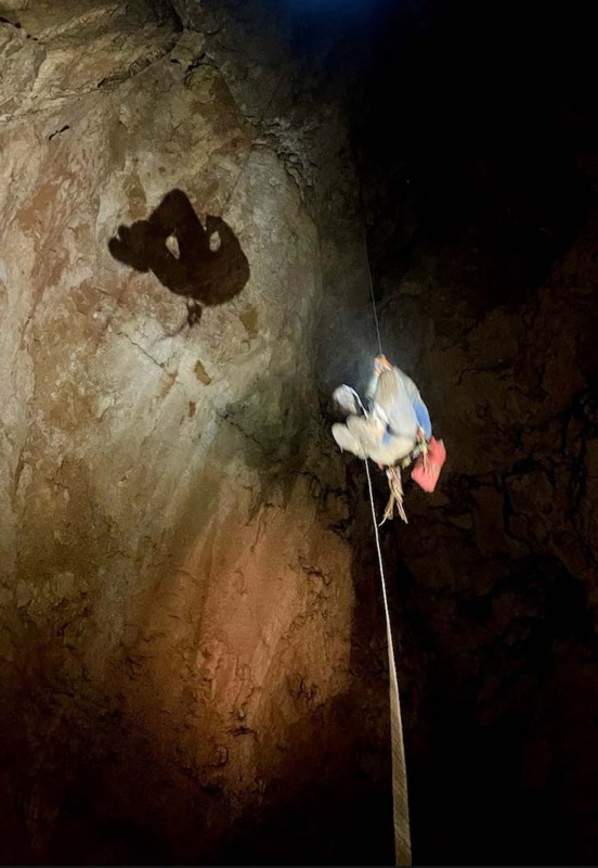 Après une belle nuit en bivouac, nous nous dirigeons vers l'aven des Pauvres qui, après deux petits puits de 8 m et 20 m, se poursuit par un méandre étroit de 20 m débouchant sur le fameux P 153 (Puits des Orages, 153 m). Le départ étroit s'agrandit de plus en plus au cours des 130 m de descente en deux sections (50 m et 80 m) sans toucher le sol.