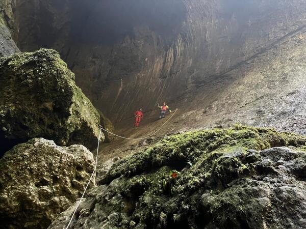 Pour commencer, direction l'abîme de Mas Raynal. C'est un puits très large de 100 m, avec un jet de 60 m dans le grand vide et un jet de 40 m lorsque les parois se rapprochent.