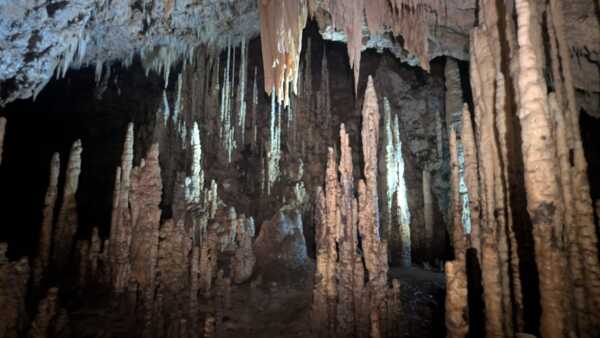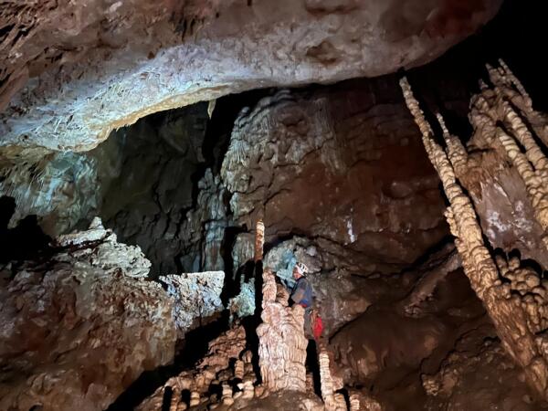 Un puits de 55 m nous amène à un toboggan qui descend au fond d'une très grande salle occupée par une forêt de colonnes et concrétions diverses. Explo rapide et décor toujours aussi esthétique.
