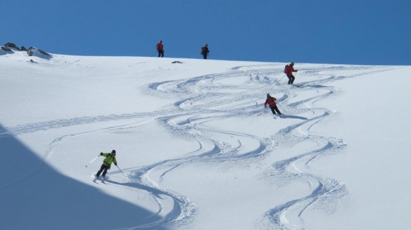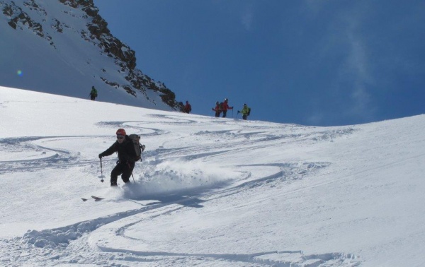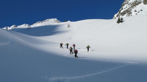 Ensoleillé, frais. Départ au lever du jour. Michel notre organisateur, patraque, reste au gîte, dommage pour lui. Combe du Tepey pour le col du Sambuis Nord (2525 m). Longue vallée jusqu'à 1920 m avec un soleil levant sur le cirque du fond. Une nouvelle fusée nous fait une trace qui monte dur. Et les conversions non maîtrisées sont un épuisement à chaque virage. Belle vue depuis le col. Et c'est parti pour une descente de cette combe expo Nord 30-35° dans une neige profonde de rêve, où le plaisir est total et partagé par tous. 550 m de combe descendus. Retour par la rive droite dans une neige un peu transformée et des ruisseaux à traverser.