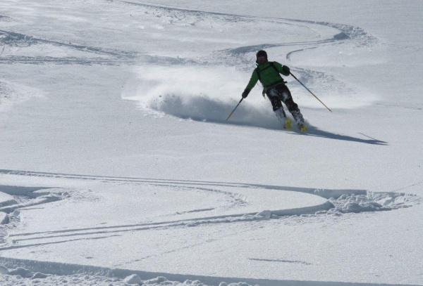 Ensoleillé et frais le matin, doux à midi au soleil. Combe des Roches depuis Les Roches 1150 m par la rive droite jusqu'à la passerelle des Plâtres, puis par la rive gauche jusqu'au rocher d'Orselle 1730 m. Belle montée ensuite dans une combe expo Nord-Est, précédés par une fusée qui nous fait une belle trace de montée jusqu'à 2250 m vers le col de Comberousse. Descente dans une neige encore froide mais bien profonde qui demande la « cuisse éneergique » que recherche Fabien. Chacun prend vraiment son pied dans cette neige qui se tient bien et qui est agréable à skier. Nous rentrons rive droite : 450 m de combe descendus, 30-35°.