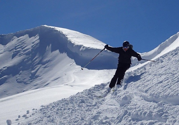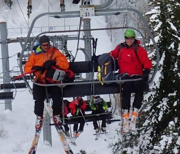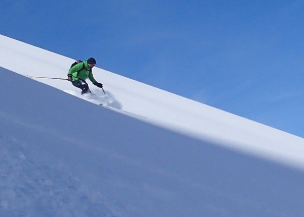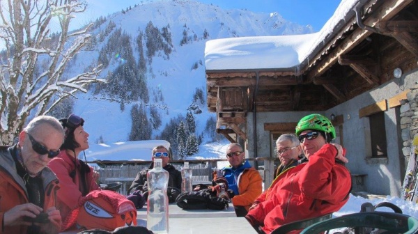 Ensoleillé et frais, pas de vent. Sur les conseils de notre autochtone et des pisteurs, ski sur St-Colomban le matin avec capuccino à l'Auberge du Coin. En fin de matinée, notre objectif du jour est le joli hors-piste local. Traversée du col de Bellard au col des Fraîches ; un peu en canard, un peu à pied, un peu à ski à 2250 m. Albert nous trouve le départ du couloir de La Plaine du Geai dans le ravin du Sapey. Un peu d'appréhension au départ, nous ne voyons pas vraiment la pente. Sur le conseil d'Albert, Jean-Philippe s'élance le premier. Albert coordonne les départs. Pente 30-35°, neige assez profonde qui tient bien et est agréable à skier. Il faut garder la trace entre la corniche de gauche et la combe de droite. Le couloir vire à gauche, il ne faut pas traîner, c'est la partie la plus exposée aux décrochages neigeux. Chacun prend son plaisir à fond pour un arrêt en sécurité. 450 m de couloir descendu. Magnifique pour tous !