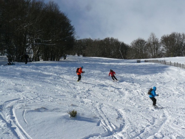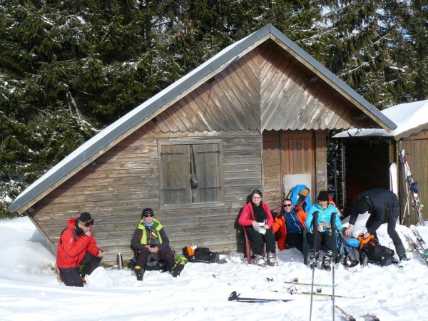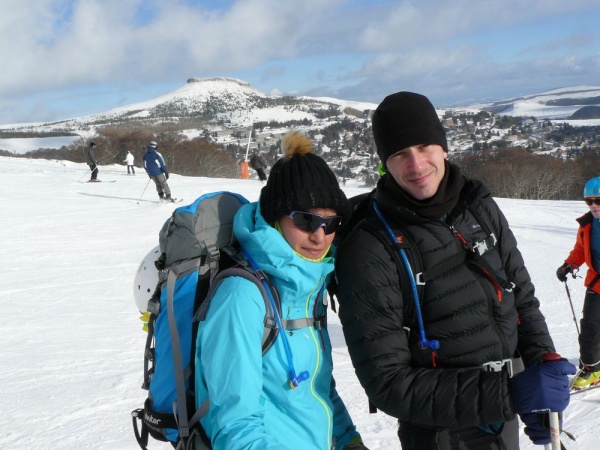 Enfin, la neige est au rendez-vous en ce samedi 14 janvier à Super-Besse, après un long mois d'attente, et ce ne sont pas des rafales de vent à 40 km/h, des averses de neige et une température de - 7 °C qui vont empêcher Pauline, Sabrine, les deux Alexandre, Guillaume et leur deux encadrants d'en profiter ! Après s'être équipés sous une averse en plein vent, début de la montée le long des pistes et, déjà, le soleil fait de belles apparitions. L'heure est venue pour le défi de la conversion ! Tous les styles sont permis. Puis la montée se poursuit dans les bois, pour arriver au site du second défi : retrouver le DVA caché dans la neige. Là aussi, chacun son style : par exemple, Guillaume s'ensevelira involontairement jusqu'à mi-cuisse dans un terrier...Tiens, voilà une bonne cachette introuvable pour le prochain cobaye ! Et le soleil est toujours là, mais la température négative rabat tout le monde au pied des pistes pour un pique-nique contre un petit chalet à l'abri du vent, le soleil pile en face. Parfait !