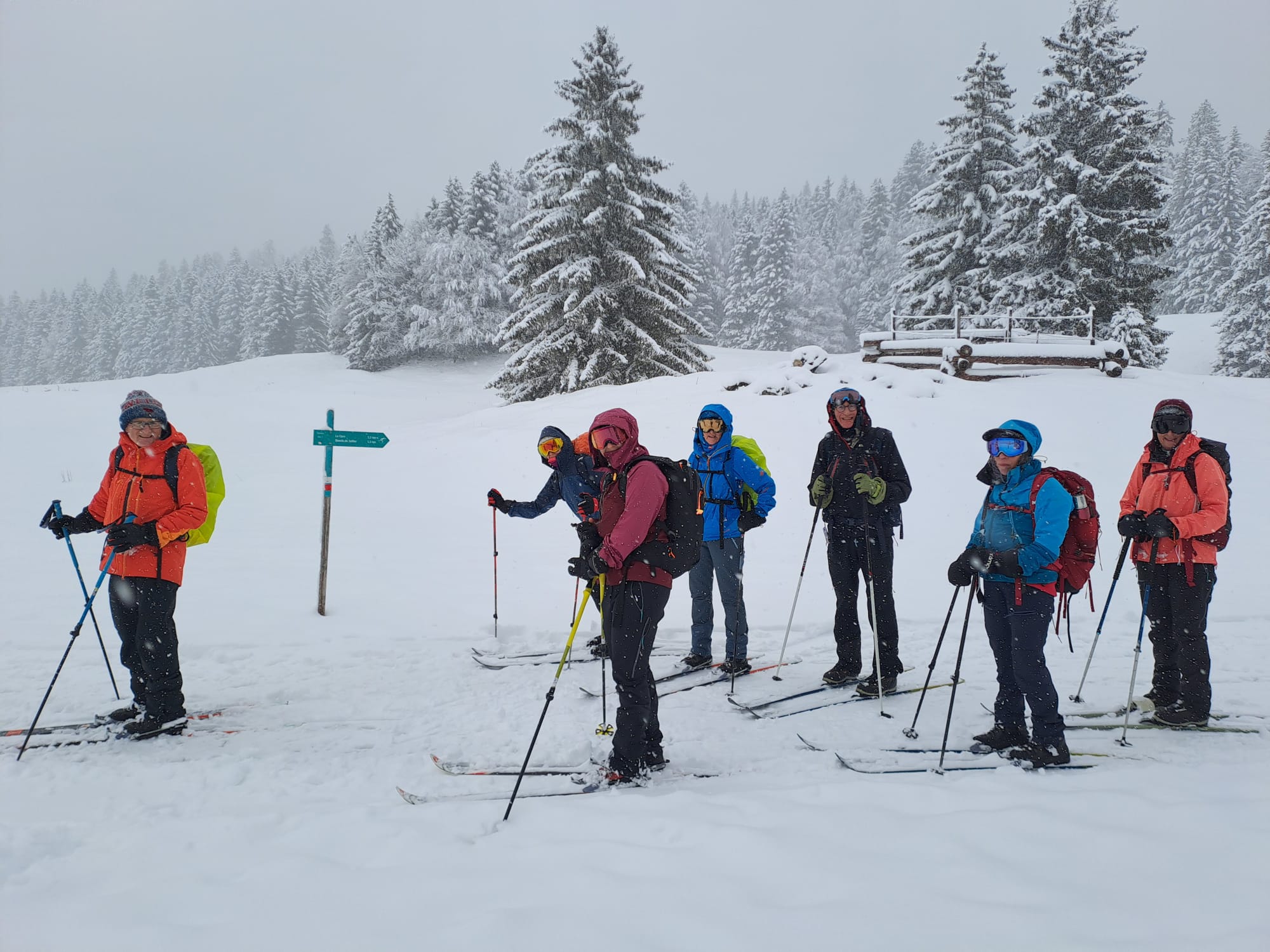 Départ pour la cabane Rochefort, accompagnés par la neige qui continue à tomber. Une belle atmosphère nous entoure, blancheur et silence par les pistes et les vallons. Les sapins chargés de neige sont magnifiques ! Halte pique-nique à l'annexe de la cabane, occasion pour les anciens cafistes de se remémorer d'épiques accès nocturnes à cette cabane ! Nous redescendons sur une neige parfois lourde qui occasionne quelques chutes.