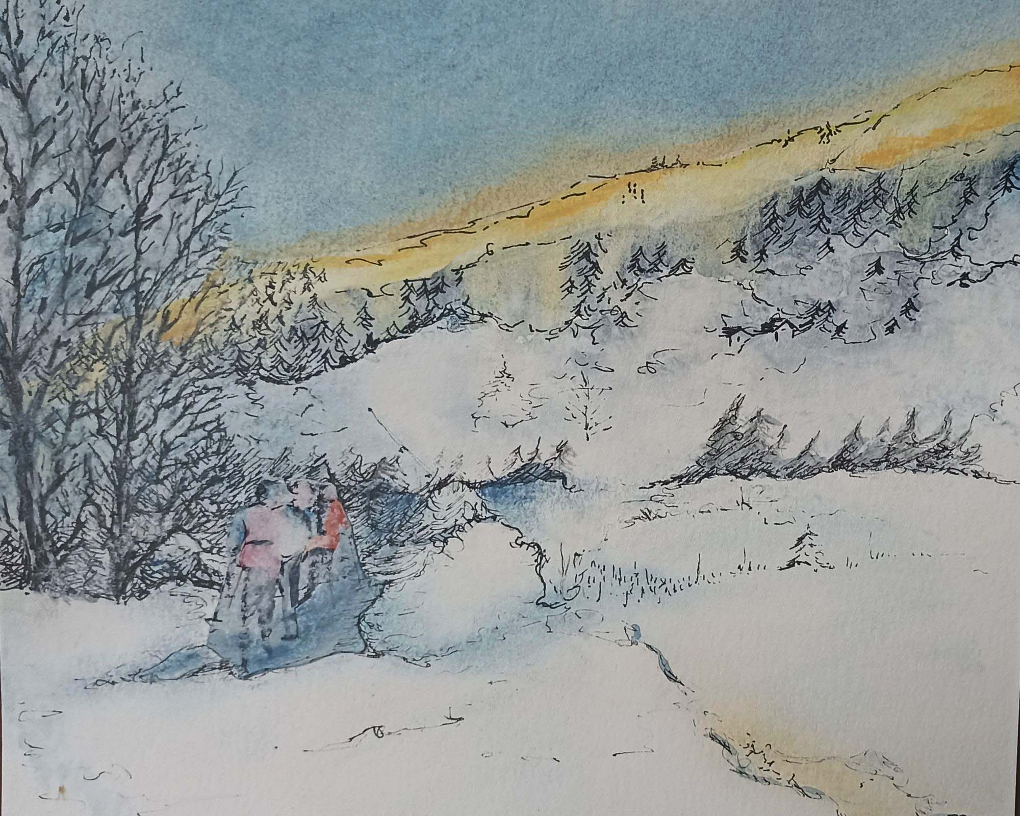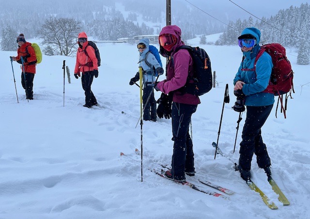Vendredi, nous repartons courageusement sous la neige, pour accéder à la cabane du Pré des Fours. Elle nous permet une pause pique-nique bienvenue à l'abri. Nous avons dérangé un sanglier qui a eu bien du mal à progresser en cherchant à se cacher. La neige qui redouble d’intensité a raison de notre courage et nous redescendons par le même chemin, empruntant les pistes plutôt que les combes très enneigées.
