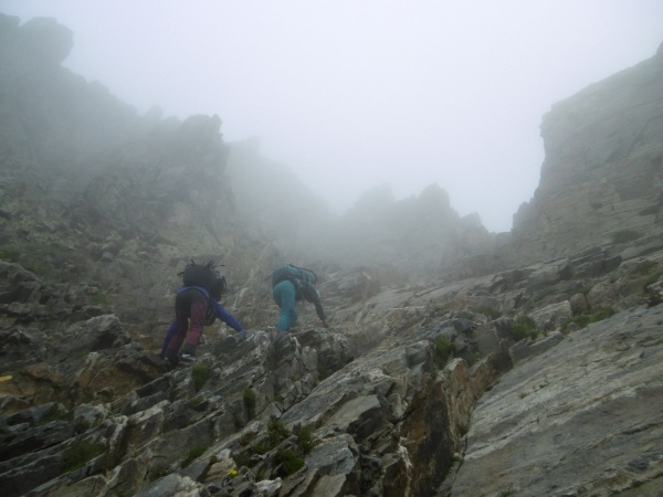 Le jour suivant, devant une météo capricieuse, nous partons tôt vers le Canigou mais pas certains de pouvoir monter au sommet. Et puis quelques éclaircies nous encouragent à quitter le GR 10 pour nous diriger vers le refuge Arago et commencer la montée jusqu'au col de Vallmanya avant la brèche Durier et la fameuse Cheminée, point ultime de décision sur la suite de notre parcours. C'est faisable mais, bien sûr, nous n'avons aucune vue au sommet. Dommage, cependant la Cheminée est vaincue : quelle satisfaction, surtout pour Marie et Marie-Odile, casque sur la tête !