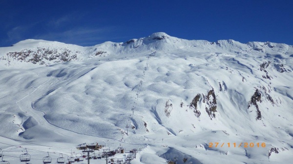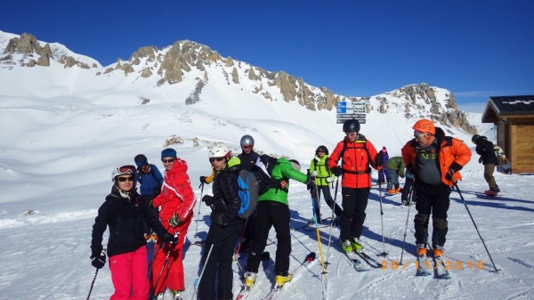 Samedi 27 novembre matin, rendez-vous à 9 h sous un grand soleil pour « tâter » la première neige. A l’arrivée, les stands des fabricants de skis nous attendent, ce qui nous donnera l’opportunité de tester plusieurs modèles. Albert avait réservé deux moniteurs ESF pour nous faire (re)découvrir le domaine jusqu’à 13 h. Petite virée sur Tignes avant un casse-croûte face à la montagne. L’après-midi, un groupe est parti sur Tignes ;  Marc, Nathalie, Michel ont essayé de nouveaux skis et nous sommes allés tester les bords de pistes. Pas mal du tout ! Bonne remise en jambes… Fin d’après-midi à la carte : Fabien n’en avait pas assez, alors il a mis les peaux pour crapahuter un peu, d’autres sont allés faire des courses en « ville » et nous étions trois au sauna et au hammam. Tout le groupe s’est retrouvé ensuite au 102 pour un verre et des grignotages avant de tester un nouveau resto, La casserole, et déguster fondues et cassolettes savoyardes.