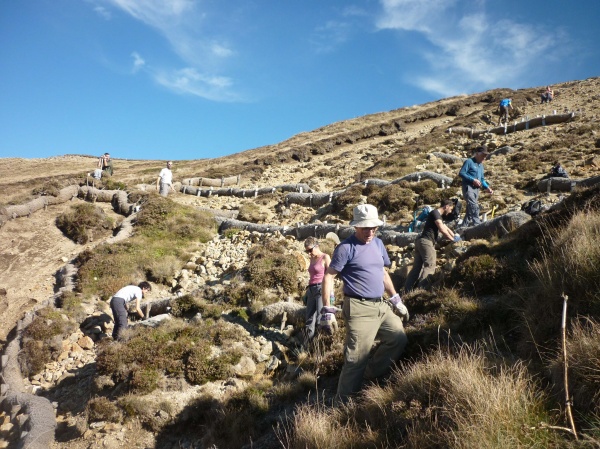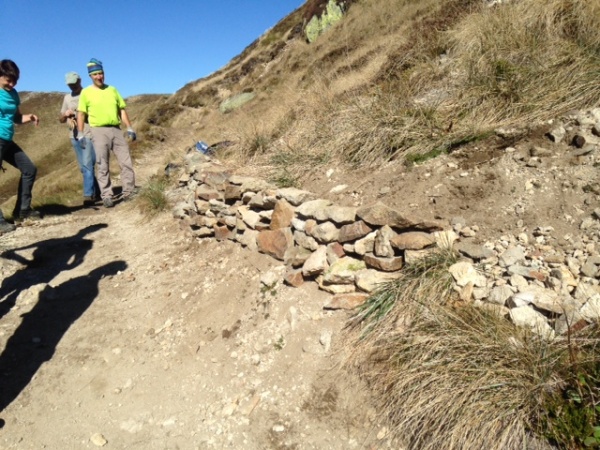 C’est sur la première ravine, la plus détériorée, que l’action débute. Elle est menée par petits groupes. Quel entrain ! Les plus costauds manipulent les gros blocs avec aisance. Sept murets sont créés en aval du chemin, Guillaume n’en avait prévu que quatre ! Puis c’est l’heure de la pause et du casse-croûte. Tout le monde profite du soleil généreux de l’été indien. Le travail reprend, toujours par petits groupes. En amont du sentier, de nouveaux murets sont élevés en travers de la ravine. Sur la plate-forme d’arrivée des sentiers, des murets plus petits sont créés le long des chemins. Ils éviteront aux randonneurs de divaguer en dehors de la trace. Ailleurs, des boudins coco sont étançonnés en bordure de sentier. Enfin, un petit groupe poursuit l’action sur les deux autres ravines.