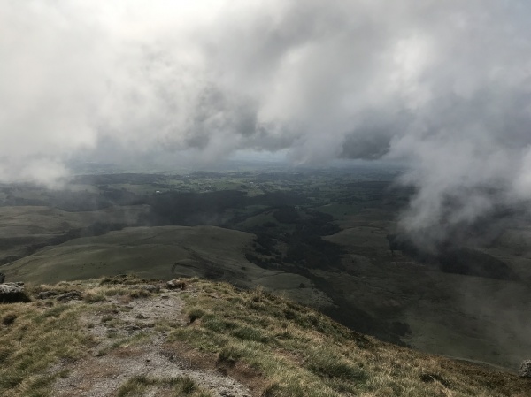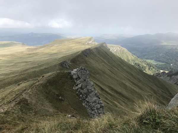 Les nuages arrivent à grand pas et le vent se lève alors que nous remontons par le puy Gros (1793 m) vers le col de la Cabane (1 781 m) où nous rencontrons l’un des ravitaillements du trail du Sancy. Pour autant, des fenêtres de beau temps nous permettent d’admirer les paysages.
