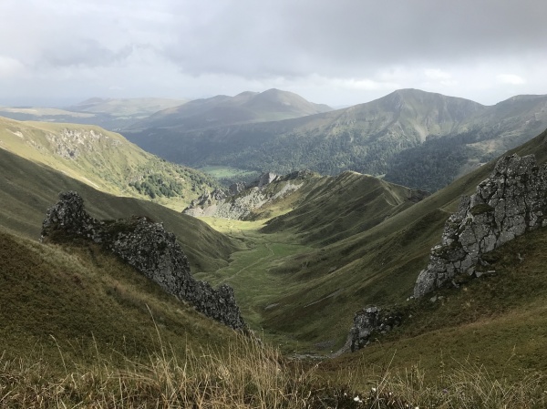 C’est reparti après cette pause vers les sommets par le Val de Courre : direction le col de Courre. Très belle arrivée sur les crêtes avec une vue sur toute la vallée du Mont-Dore et la Fontaine Salée.