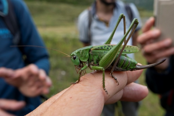 Patrick nous emmène aux sources de la Dordogne, au bas du Val d'Enfer et au début du Val de Courre. Il distribue trois paires de jumelles à ceux qui n'en sont pas équipés. Si les animaux se font un peu prier en début d'après-midi, ils se montrent nombreux par la suite. En cumulant les observations des deux groupes, nous voyons seize chamois, deux mouflons, des marmottes siffleuses, sans oublier une très belle sauterelle.