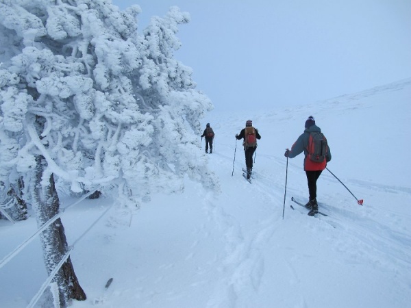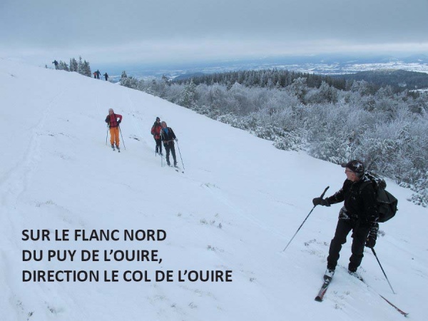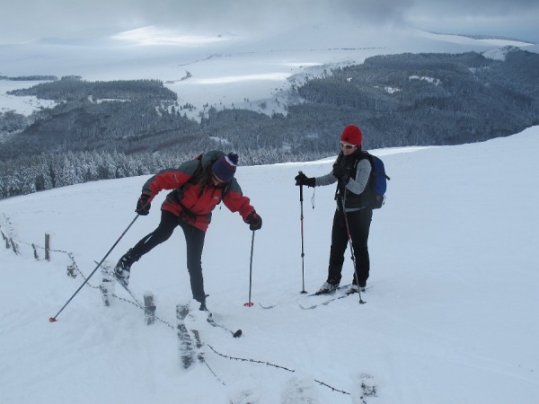 Nous rejoignons ensuite le col de l’Ouire en nous accordant une séquence gymkhana dans la montée à travers bois sur le flanc nord du puy de l’Ouire. La montée du pied du puy Corde jusqu’au GR qui longe le bord nord de l’Aiguiller, sur une neige dure par endroits, n’est pas de tout repos. Mais nous pouvons profiter d’une belle vue sur les sommets enneigés de la région, puis nous régaler avec une longue descente dans les grands espaces sur une neige devenant de plus en plus facile à skier !