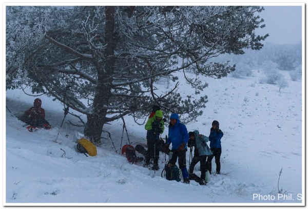 Les autres montent sagement alignés, il n'y a pas grand chose à voir. Ciel gris, flocons, arbres pleins de neige, 20 cm de fraiche au sol. Sommet de Louchadière vers 11h.