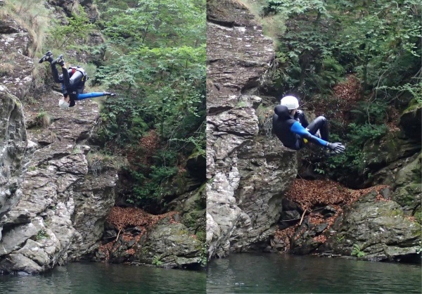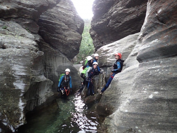 Tous les autres gagnent le ruisseau de Fustugères pour enchaîner les rappels. La météo maussade nous laisse un créneau pour avoir chaud durant la marche d'approche et nous équiper au sec. C'est ensuite parti pour six ou sept heures de canyoning. Eh oui, faire passer une dizaine de personnes dans chaque groupe prend du temps à chaque saut et à chaque installation de cordes. La pluie s'est invitée une partie de la journée, mais après tout, mouillés pour mouillés...