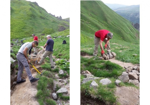 Bernard, Eric, Frédérick, Guillaume, Loïc et moi nous retrouvons sur le parking du téléphérique le dimanche 22 mai, à 9h30. Guillaume Trapenat, notre partenaire de la Réserve de Chastreix-Sancy, nous accueille. Le soleil est radieux. Une petite randonnée nous emmène à pied d'œuvre. Armés de pelles et de pioches, nous égalisons le terrain raviné. Nous entretenons ou créons des renvois d'eau, canaux obliques qui rejettent l'eau de ruissellement hors du chemin. Nous plaçons des pierres en travers de traces secondaires pour en décourager l'accès.