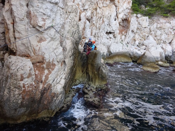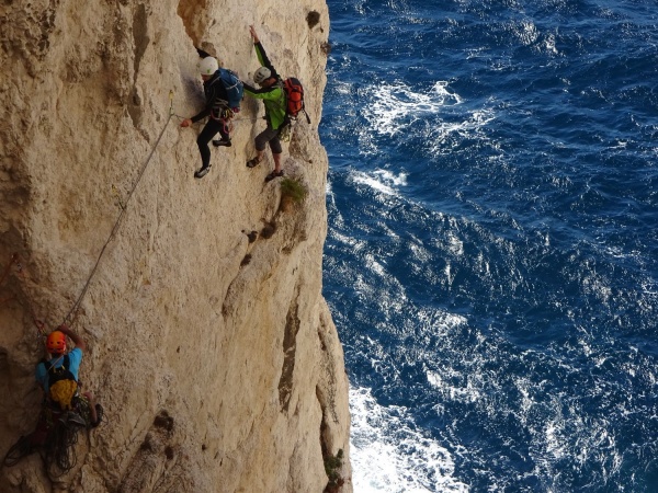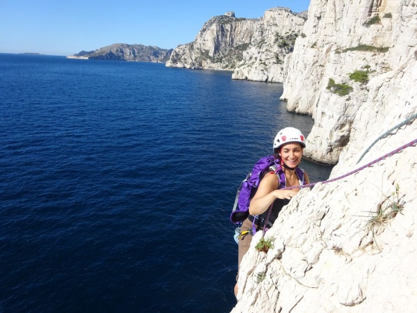 Rien à voir avec l'escalade conventionnelle où tu grimpes vertical et tu redescends dans la voie : ici, tu arrives par en haut, en commençant par deux rappels, puis s'en suit une traversée parfois dans la terre, parfois accroché à la végétation ou à un arbre. La « traversée Ramond », c'est retomber un peu en enfance... Il y a un passage où tu traverses assis sur une branche, avec une bonne trentaine de mètres de vide sous les pieds. L'ambiance est conviviale et détendue, je découvre mes nouveaux compagnons de cordée, Raphaël, Jean-Yves et Véro. Ils sont calmes, sereins et maîtrisent parfaitement toutes les techniques : je me sens parfaitement en sécurité, c'est très agréable de grimper avec eux, et le mistral s'est calmé ! Aujourd'hui, c'est un peu les vacances en comparaison des dix heures d'efforts de la veille, mais il faut quand même une bonne journée pour la faire.