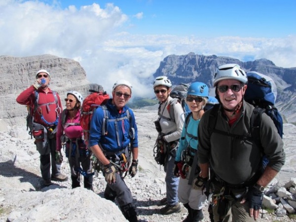 Le lendemain, nous préférons faire deux groupes, car la via Bocchette Alte s'annonce « physique ». En effet, échelles, escalade, désescalade se succèdent sur la via 305. L'autre groupe prend le sentier Casinei 328, puis le sentier Galleria Bogani 318, petit arrêt au refuge Brentei et montée au refuge Alimonta (2 580 m).