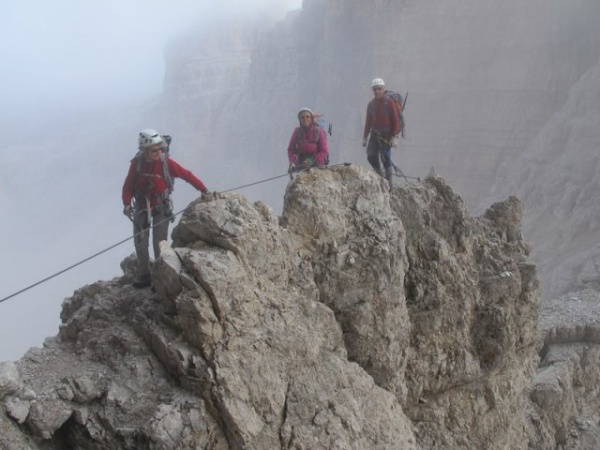 Mercredi, après une pluie matinale, le ciel est très dégagé. Nous traversons d'abord un glacier puis accédons à la via ferrata Bochette Centrali : vires, échelles, escalade, désescalade... Mais comme le brouillard arrive, nous ne pouvons pas apprécier le vide qui nous entoure. Hélas ! Ce devait être les plus beaux paysages : les Campaniles, la cima Brenta, etc. Descente vers le refuge Pedrotti (2 487 m), la pluie arrive, nous déjeunons dans le refuge en nous laissant tenter par minestrones et strudels.