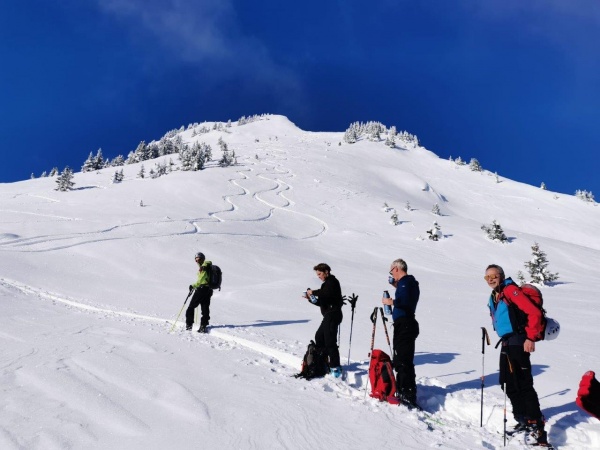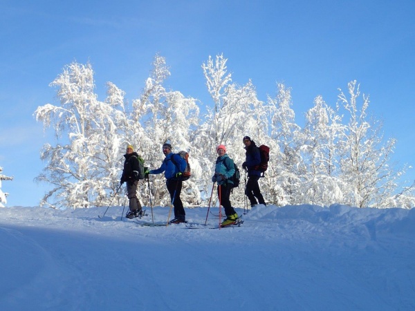 Dimanche s’annonce plus maussade : les uns partent sur la Trace Pro, au départ du Planay, les autres remontent les pentes vers le chalet du Mirantin. Nous nous arrêtons sagement en haut du téléski de la Grande Combe, le BRA mentionnant un risque 4. Quelques-uns nous quittent en tout début d’après-midi pour rentrer sur Clermont et respecter le couvre-feu de 18h.