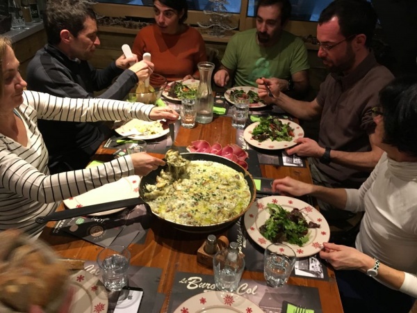Soirée sympa au buron de la Croix Saint-Robert, une adresse très cosy, où l'on peut se détendre devant la cheminée, avachis dans des canapés pleins de coussins. C'est le lieu idéal pour un excellent vin chaud, une délicieuse truffade persillée accompagnée de charcuterie du pays et de belles tartes aux myrtilles. On a profité de tout !