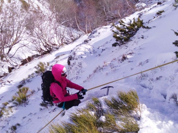 Quelques foulées plus loin, la descente vers le ruisseau de Diane présente, à cet endroit, quelques difficultés intéressantes que Stéphane ne manque pas d’exploiter en installant une sangle autour de deux sapins, puis un mousqueton et une corde. Isabelle nous donne des infos complémentaires, nous formons nos machards et c’est parti...
