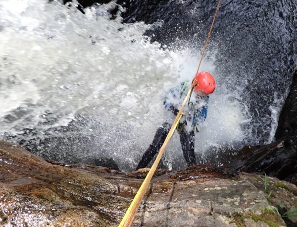 Nous continuons ensuite avec les deux cascades principales que Julien a équipées pour descendre en rappel. Albert nous trouve bien timorés de ne pas enchaîner avec les sauts au pied de la première !