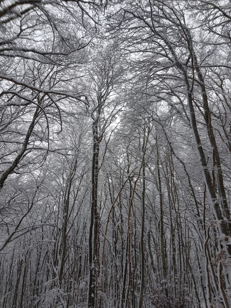 Et c'est reparti dès 9h00 en commençant par la montée du puy de Louchadière. Une belle montée en suivant un chemin forestier, puis un sentier dans lequel des petits arbres forment un couloir blanc, nous contraignant légèrement à nous courber (le sac de Sylvie a bien résisté, même à une petite branche qui y est restée accrochée !).