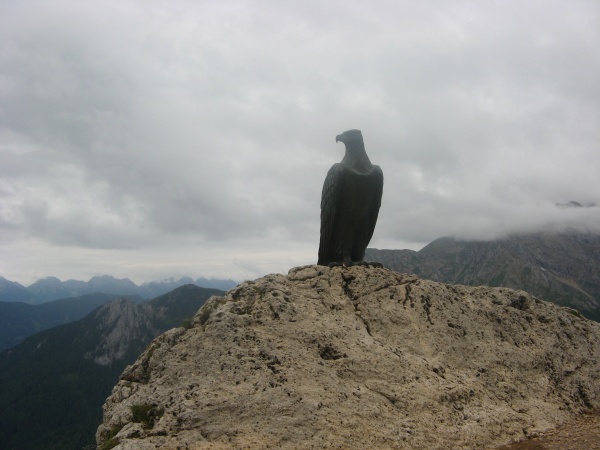 La pluie n'est pas encore là, mais les reliefs alentour sont déjà noyés dans des brumes tenaces. Les falaises où chemine la via que nous projetions de parcourir (longue traversée de 5 h) restent totalement masquées par les nuages. Le rocher, encore humide des averses de la veille, freine notre optimisme. Sagement, nous renonçons à notre objectif et rejoignons la cabane suivante par le sentier de randonnée en balcon. A mi-chemin, nous admirons un majestueux aigle en bronze posé sur un rocher au bord du chemin et qui semble nous observer. Une plaque à la mémoire du réalisateur de cette œuvre ne nous renseigne guère sur sa symbolique. Le refuge A. Fronza (Kölner Hütte), 2337 m, notre but, se profile à l'horizon. Le ciel semble alors nous offrir une accalmie. Nous décidons l'ascension du col Passo Vajolet (2650 m) qui marque en fait la sortie de la via que nous devions emprunter. Les 300 m de dénivelé qui nous en séparent sont avalés en 45 mn, malgré quelques passages acrobatiques avec câble et échelle ; là-haut, la brume nous rattrape, nous privant de tout panorama ! Redescente rapide pour récupérer nos sacs abandonnés derrière des rochers et poursuivre vers le refuge alors que quelques gouttes nous font accélérer le pas.