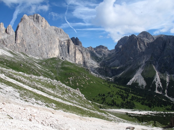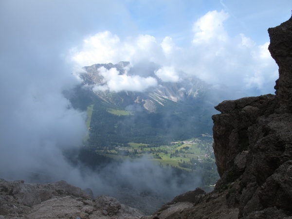 Mardi 26 : réveil et petit déjeuner à 7 h 30.  Ouf !  Le soleil est au rendez-vous. Itinéraire de la journée : rejoindre le refuge Roda di Vael (2283 m) en empruntant le sentier 541 qui chemine en balcon jusqu'au Col de Zigolade (2579 m) ; quelques passages délicats demandent un peu d'attention. Au col, le panorama à 360° est magnifique. De notre observatoire, nous surplombons le vallon que nous avons quitté ce matin. Au-dessus de nos têtes, vue sur notre objectif du lendemain : Via del Masarè suivie du sommet du Rotwand (2806 m). Pause au col, où Jean en profite pour découvrir et escalader les proches environs. Nous avons en point de mire notre prochaine cabane. Brusquement, la brume nous enveloppe et il faut reprendre la marche. Jean dévale en tête. Le ciel se dégage et nous invite à pique-niquer sur un large promontoire herbeux. Mais l'accalmie est de courte durée, nous repartons en accélérant le pas pour arriver au plus vite à notre cabane où une grosse averse nous accueille. Sauvés... nous sommes à l'abri !