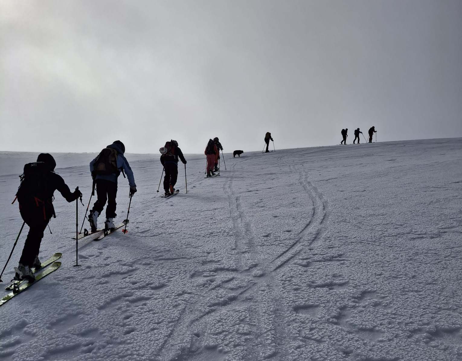 Nous repeautons et repartons en faisant attention aux skieurs. Nous nous lançons dans une ascension assez exigeante en pleine chaleur, qui nous permet de rejoindre les crêtes. Nous suivons alors le chemin des crêtes, jusqu’à retourner sur le puy des Crebasses. L’occasion de s’entraîner à descendre des petites pentes avec les peaux.