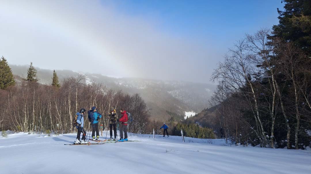 Le départ est prévu au Chambon-des-Neiges. Lorsque nous arrivons, nous sommes accueillis par un vent fort et glacé qui nous fait regretter notre lit douillet. En avant ! Pour démarrer, nous devons porter nos skis : l’occasion d’apprendre quelques astuces pour les attacher à son sac à dos. Et nous voilà dans les bois où nous pouvons chausser assez rapidement.