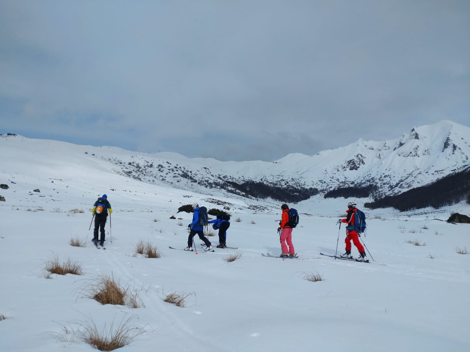 Une première pente raide nous permet de réviser le dérapage ! Un peu plus loin, nous voyons comment vérifier la présence d'un petit mur dans la descente qui peut servir de repère en cas de mauvaise visibilité.