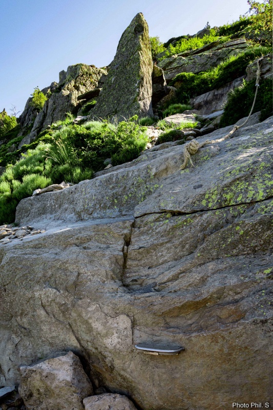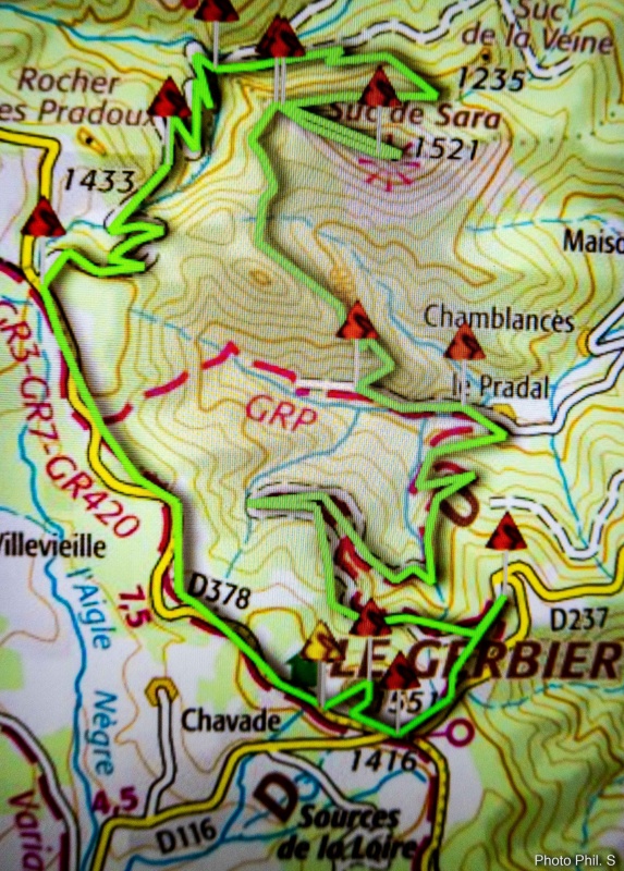 Croix de Peccata, mont Mézenc et ses belles tables d'orientation, puis col de la Croix de Boutières. On contourne le Mézenc par Gandoulet, La Charra et Médille, avant d'atteindre la Grosse Roche dont on gravit la face nord sans oxygène. Puis vient le tour de la Roche Pointue dont la forme est... surprenante : elle est pointue ! Retour à la Croix de Peccata, cette fois-ci noire de monde et de véhicules.