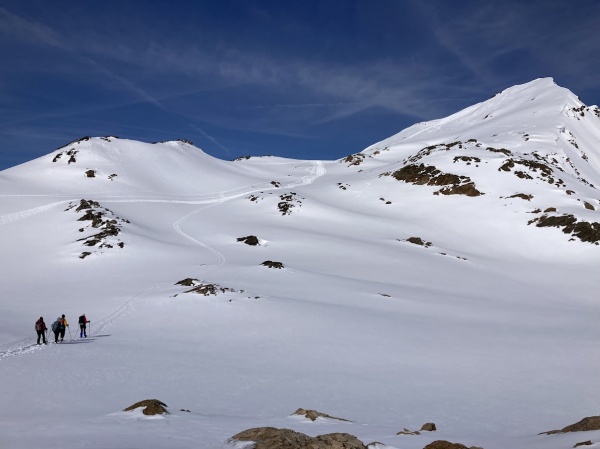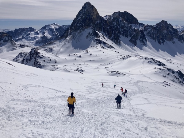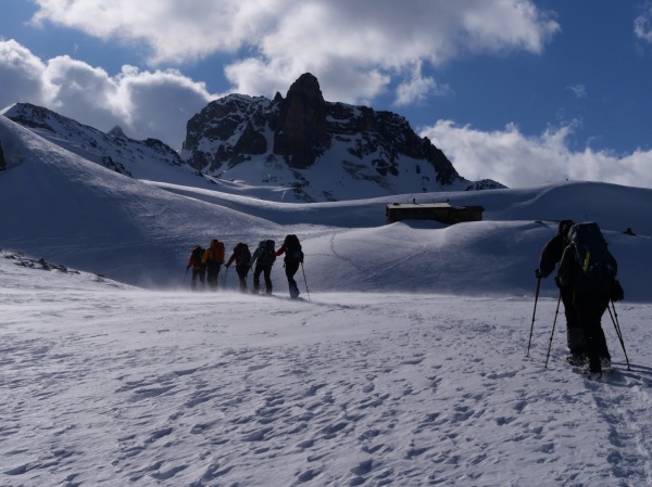 Après une nuit entre deux eaux pour la plupart, départ à 7h30 pour la pointe de Terre Rouge 3080 m, 700 m de dénivelé au total, 3h15 pour atteindre le sommet. Le cadre est très sauvage, nous croisons juste un groupe de raquettistes dans la descente de notre sommet du jour.