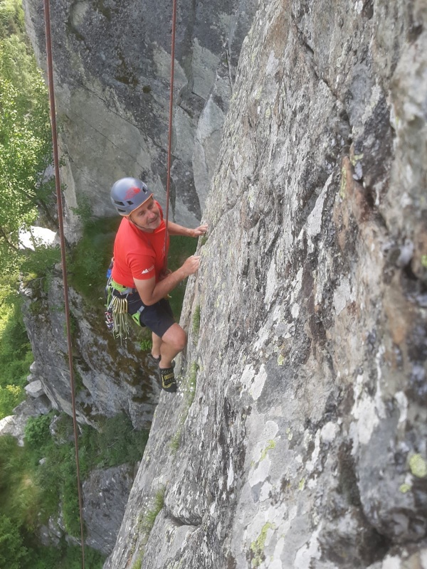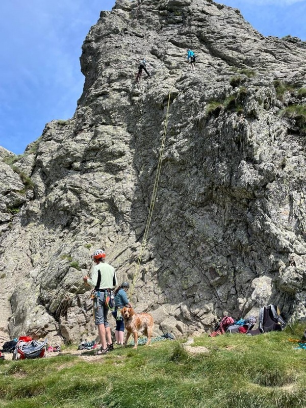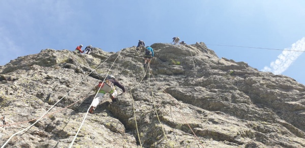 Le site est vraiment super sympa et tout à fait adapté à de l’initiation (il y a un relais au sol, pour revoir les manip, et une ligne de vie entre les relais intermédiaires, pour y circuler). Il permet de faire de la grande voie (qui peut être installée directement d’en haut, au besoin), et les voies faciles sont très rapprochées. Du coup, entre ceux qui sont posés au relais intermédiaire et ceux qui grimpent, chacun à son rythme, on a toujours des copains à proximité immédiate, et l’impression de vraiment grimper « ensemble » !
