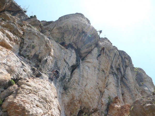 Le trotteur benjamin mène la troupe : Philippe, 5 ans, suivi de sa maman Delphine, puis Agnès, Élodie, Édith, Odile, Aurélie, Guilhem, François, Nicolas et Christian. Les 500 premiers mètres posent un premier problème d’itinéraire. Ceux qui marchent dans les ronces ne sont manifestement pas sur le bon. Les ferratistes, sans guide randonneur – eux – arrivent pourtant avant nous au lieu où nos chemins se séparent : les randonneurs suivent la montée sur le Causse de Sauveterre, traversant le village de Liaucous, pendant que les ‘via-ferrayeurs’ enfourchent baudriers, longes et chaussures appropriés, sans oublier LA poulie, qui, justement, n’a pas été retrouvée à l’issue du week-end (…).