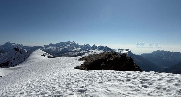 Nous atteignons notre objectif à 9h45, et profitons d’une vue dégagée sur les Alpes, et plus spécifiquement les massifs italiens du Grand Paradis, et sur le mont Blanc.