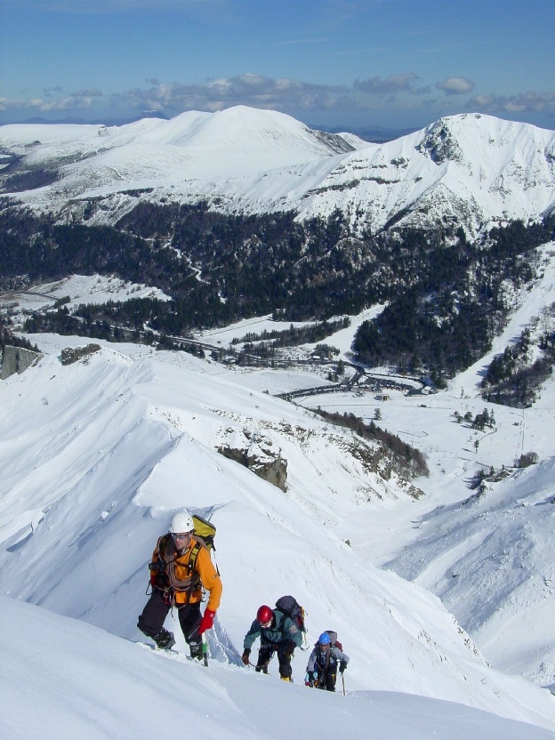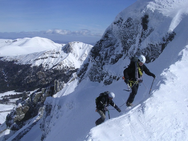 Niveau 2 (pour initiés) : l'activité se pratique sur terrain exposé aves risque de glissade pouvant nécessiter quelques passages d'escalade facile. Vous avez participé à plusieurs initiations dans le Sancy. Vous avez acquis la maîtrise de la progression en neige ou sur glacier et êtes à l'aise avec les manœuvres de corde ; vos connaissances vous permettent d'accéder à la haute montagne sur des itinéraires faciles ( cotation ''F'' de l'UIAA)