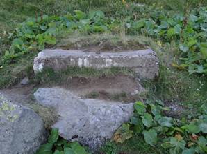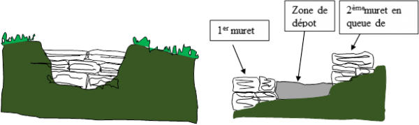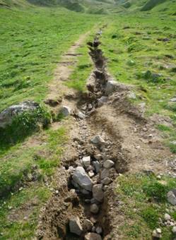 Le 8 octobre, nous mènerons un chantier de restauration dans le Val de Courre en collaboration avec la Réserve naturelle nationale de Chastreix-Sancy. En fond de vallée, le ruissellement a créé des zones d'effondrement (ravines), qui empiètent sur le chemin. Nous construirons des murets dans les ravines pour freîner l'eau. L'érosion sera réduite et les ravines se reboucheront. Par ailleurs, des blocs de béton, restes d'une remontée mécanique, artificialisent et défigurent la vallée. Nous briserons deux blocs dont le béton est friable, à l'aide de burins et de massettes . Les images qui suivent montrent un bloc de béton, une ravine et le schéma des murets.